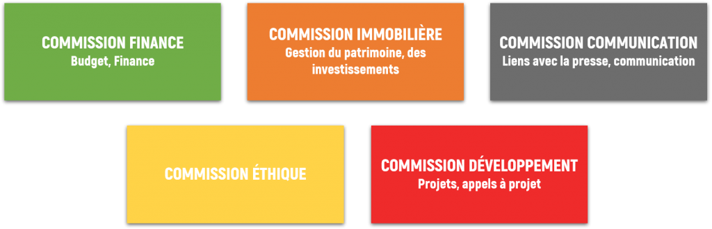 Un responsable pour chacune des commissions est nommé parmi les administrateurs. Leur composition et leur périodicité ne sont pas fixées. Elles dépendent de la thématique à traiter.